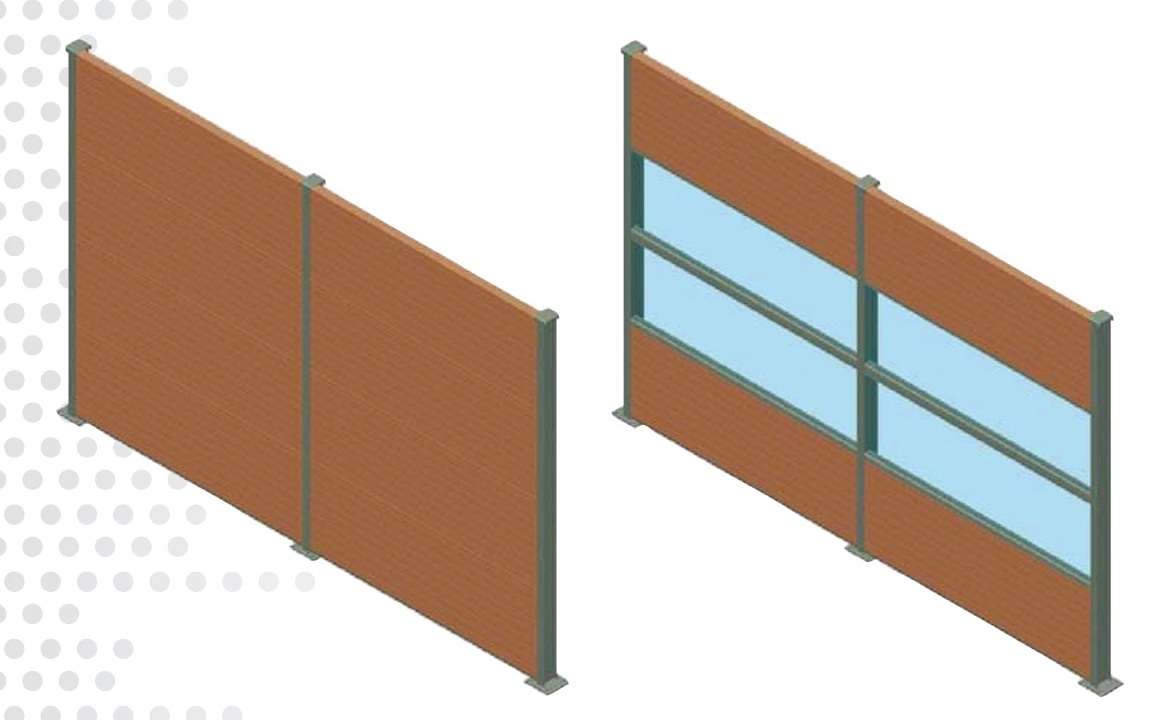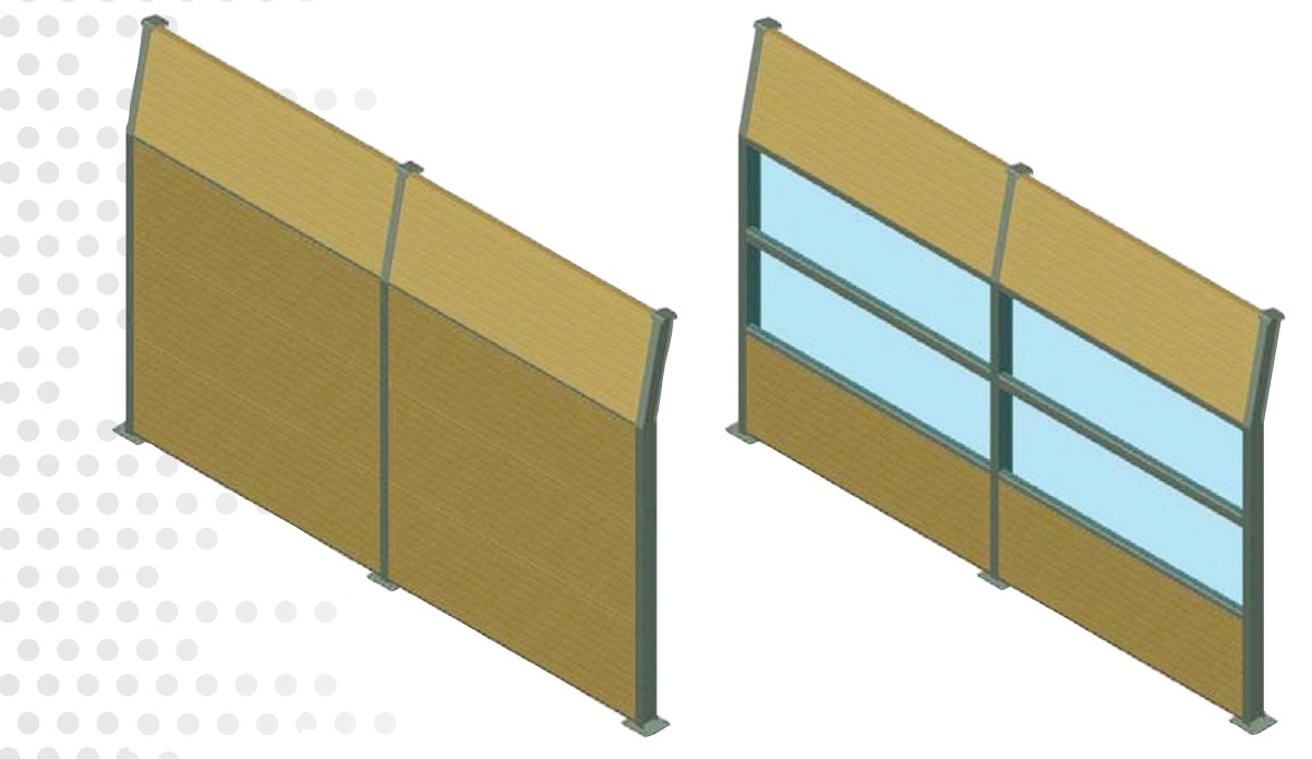 Комбинированным называется шумозащитный экран, состоящий из разного вида панелей. Как правило это чередующиеся ударопрочная, светопрозрачная и акустическая панели.